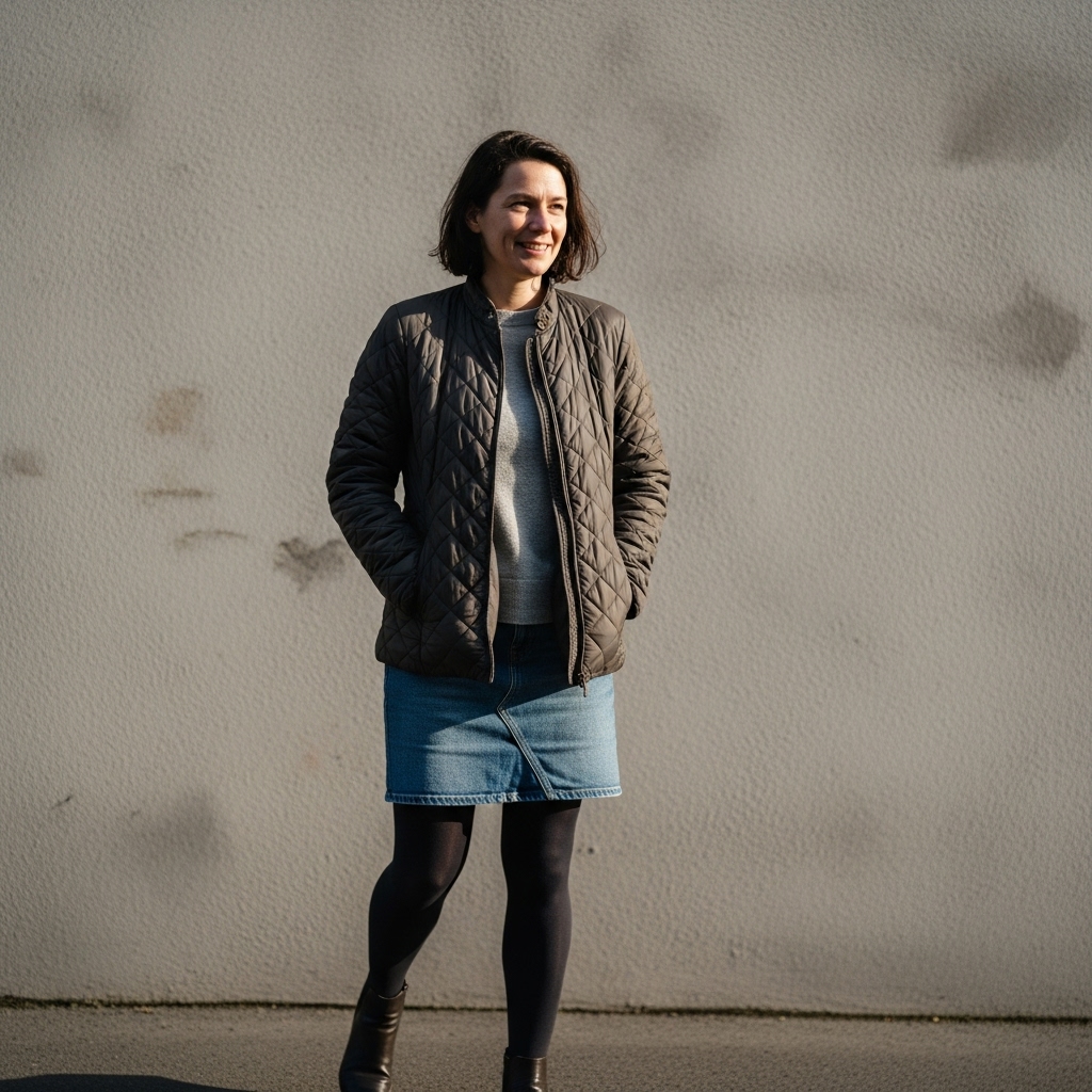 Pair a quilted jacket with a denim skirt, tights, and ankle boots for a playful fall city vibe. Add a turtleneck underneath to stay warm. This outfit blends casual elements with stylish layering, making it great for weekends exploring downtown. A crossbody bag keeps the look effortless and practical.