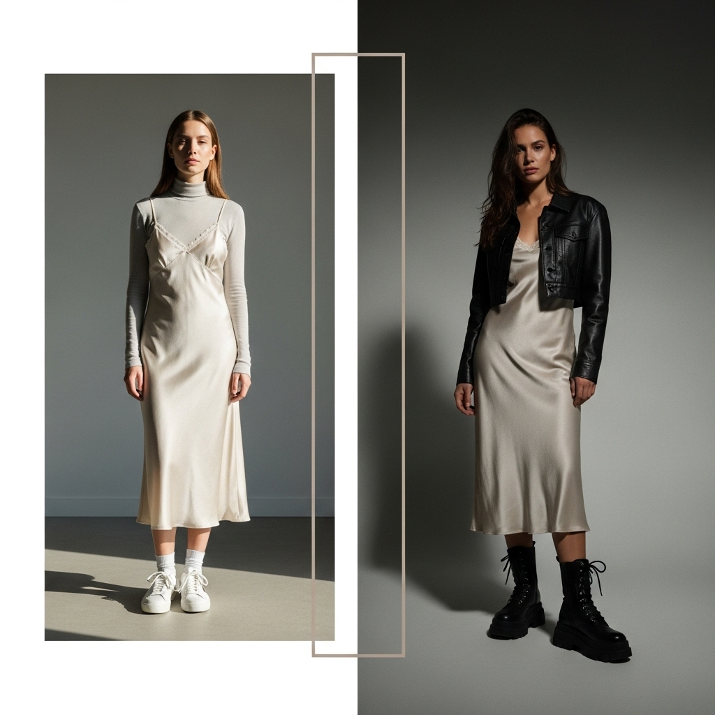 Layer a fitted turtleneck under a satin slip dress for a chic fall city outfit. Pair with combat boots or sneakers for contrast. This trendy layered look keeps you cozy without sacrificing elegance. Add a cropped jacket to complete the ensemble and make it perfect for city nights out.