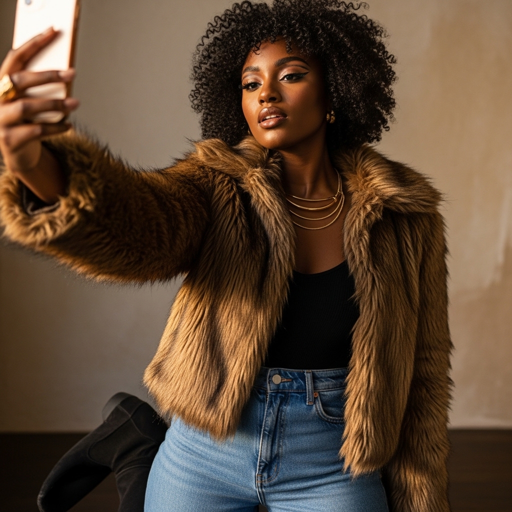 Stay stylish and warm by pairing a faux fur jacket with denim and ankle boots. This outfit instantly adds glamour to your city look while keeping things cozy. Perfect for evening outings or coffee shop hangouts. Choose a cropped fur jacket in neutral tones for versatility or bold colors for a statement.