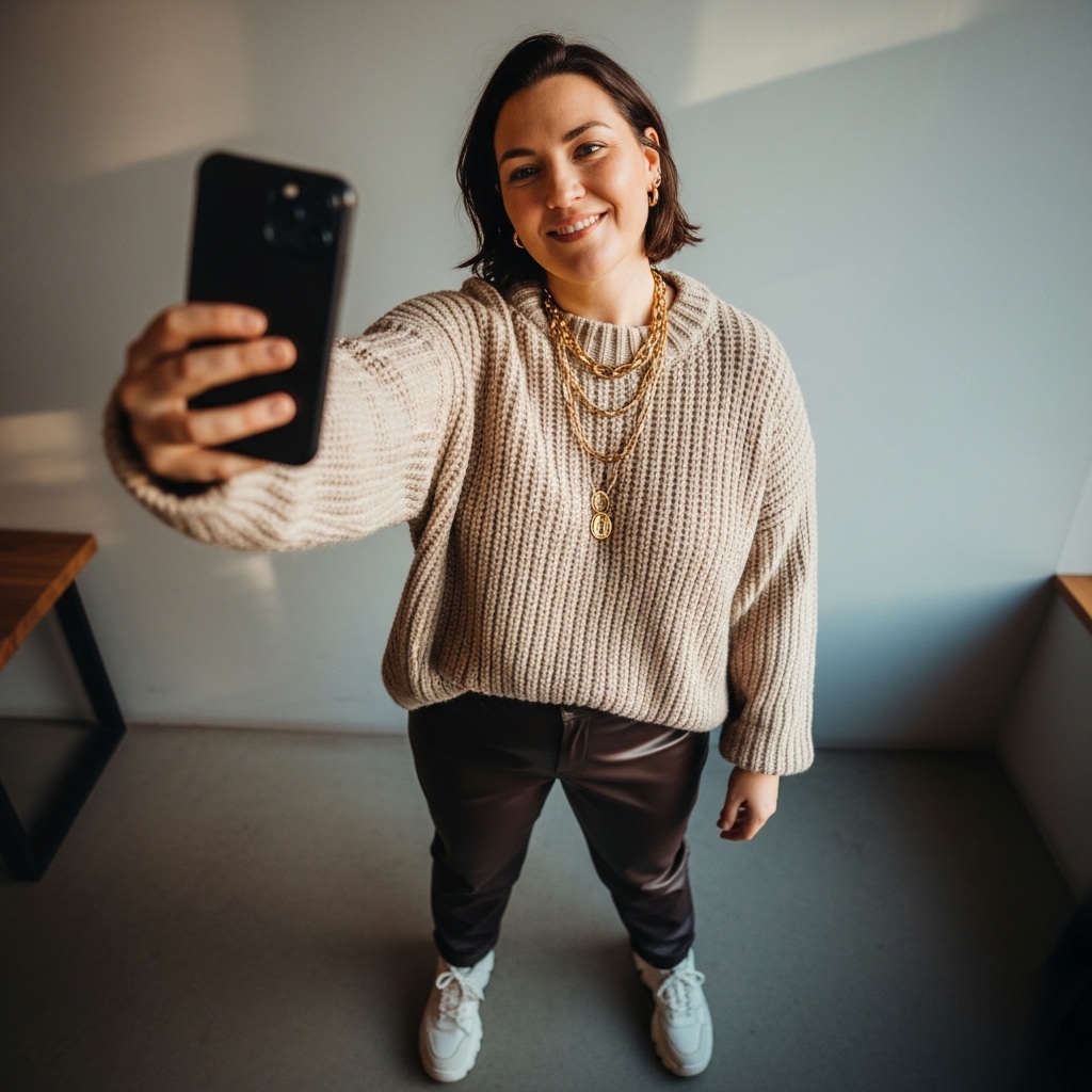 Combine an oversized chunky knit sweater with sleek faux leather pants for a stylish contrast. Sneakers or block-heeled boots complete the look while keeping it comfortable. This mix of cozy and edgy makes it a go-to outfit for casual city strolls or weekend brunches. Neutral tones elevate the vibe while gold jewelry adds a touch of shine.