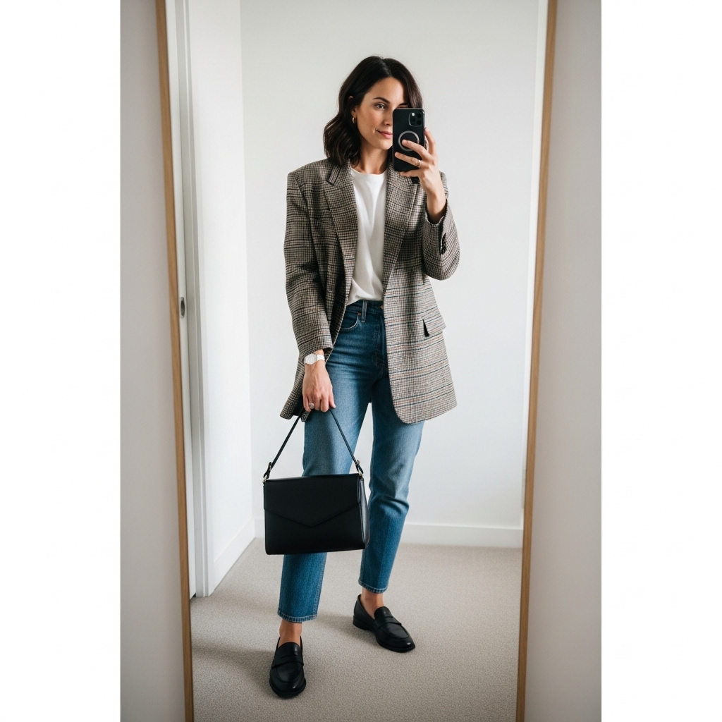 Channel a smart yet effortless vibe with a plaid blazer layered over a simple tee. Pair it with straight-leg jeans and loafers for that modern city-girl aesthetic. The structured blazer adds sophistication, while denim keeps the look relaxed. Perfect for coffee runs, casual meetings, or an afternoon shopping spree downtown.