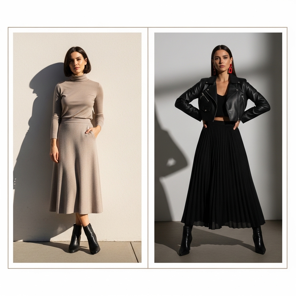 For a feminine city look, style a satin or pleated midi skirt with a fitted knit top. Add ankle boots for warmth and layer with a cropped jacket. This outfit works for daytime errands or evening dinners, offering both comfort and elegance. A neutral palette keeps it minimal, but bold accessories add personality.