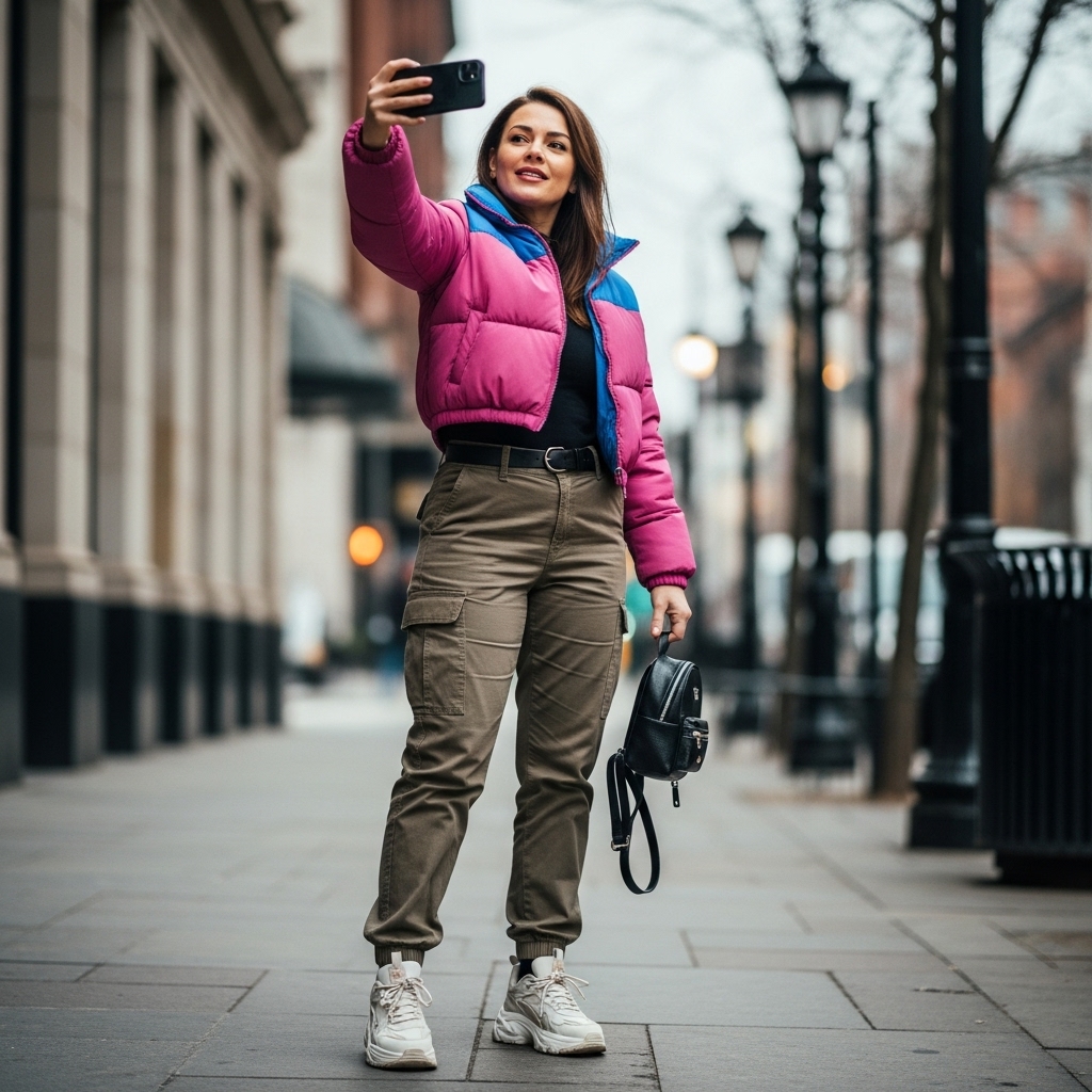 Street-style lovers can rock a cropped puffer jacket paired with relaxed cargo pants. Finish with chunky sneakers or combat boots for a trendy urban vibe. This outfit is perfect for colder fall days while keeping that city-cool aesthetic intact. Add a beanie and mini backpack for a playful touch.