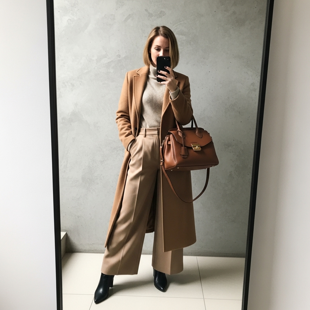 A long camel coat styled with wide-leg trousers is a staple for sleek city fashion. Pair it with heeled boots and a structured handbag for an elegant, polished look. It’s versatile enough for both workdays and evening dinners. The monochrome neutral palette makes it sophisticated, while oversized sunglasses add a chic finish.