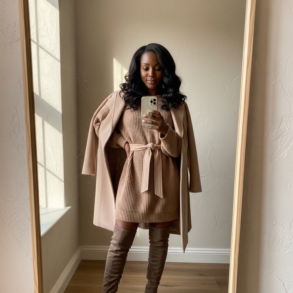 A knit sweater dress paired with knee-high boots is the ultimate fall city look. Layer with a belted coat for warmth and definition. This outfit is chic yet cozy, making it perfect for city walks or casual office days. Add a tote bag to complete the stylish city-ready outfit.