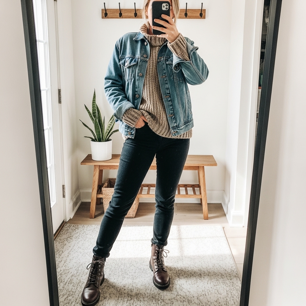 A denim jacket worn over a chunky sweater is a classic fall combination. Pair with black jeans and lace-up boots for a balanced city outfit. The layering keeps you warm while still looking effortlessly cool. A backpack or tote makes this outfit practical for long days in the city.