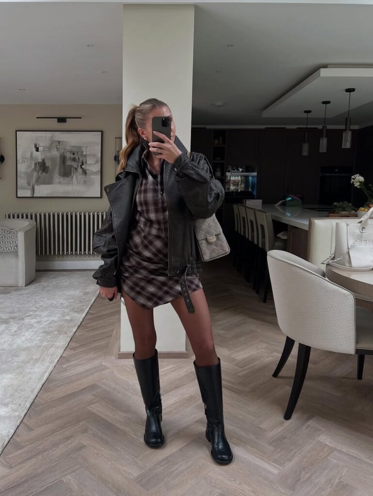 19. Plaid Mini Shirtdress with Oversized Leather Jacket and Knee-High Boots