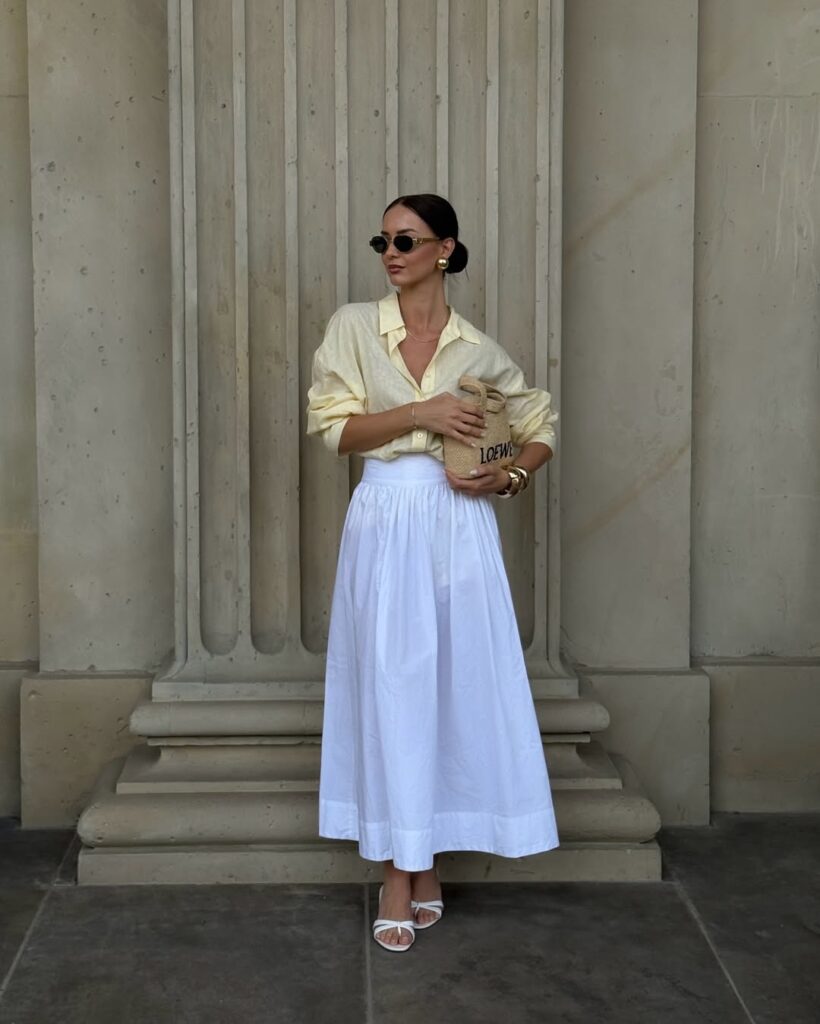 10. Buttermilk Linen Shirt with Voluminous White Midi Skirt