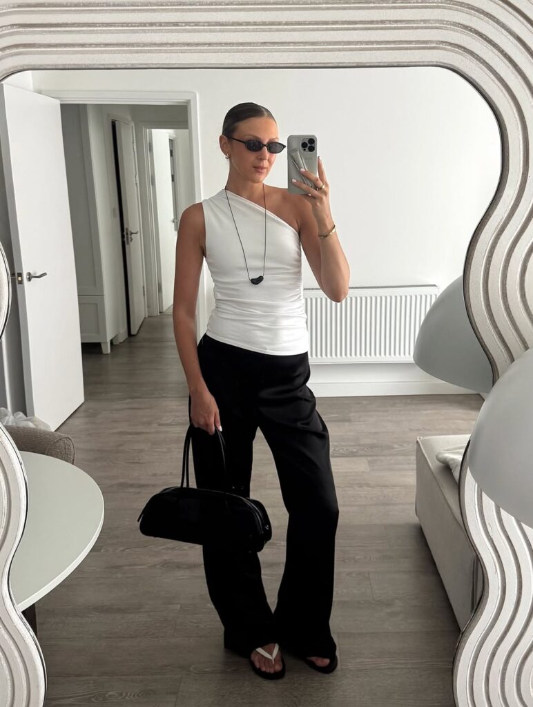 This striking look pairs a one-shoulder white top with tailored black trousers for a clean and modern silhouette. The asymmetry adds visual interest, while the trousers keep the look grounded and refined. Perfect for dinners, semi-formal events, or elevated daytime gatherings, this outfit balances boldness and minimalism beautifully. It’s comfortable enough for long days but stylish enough to make a statement.
