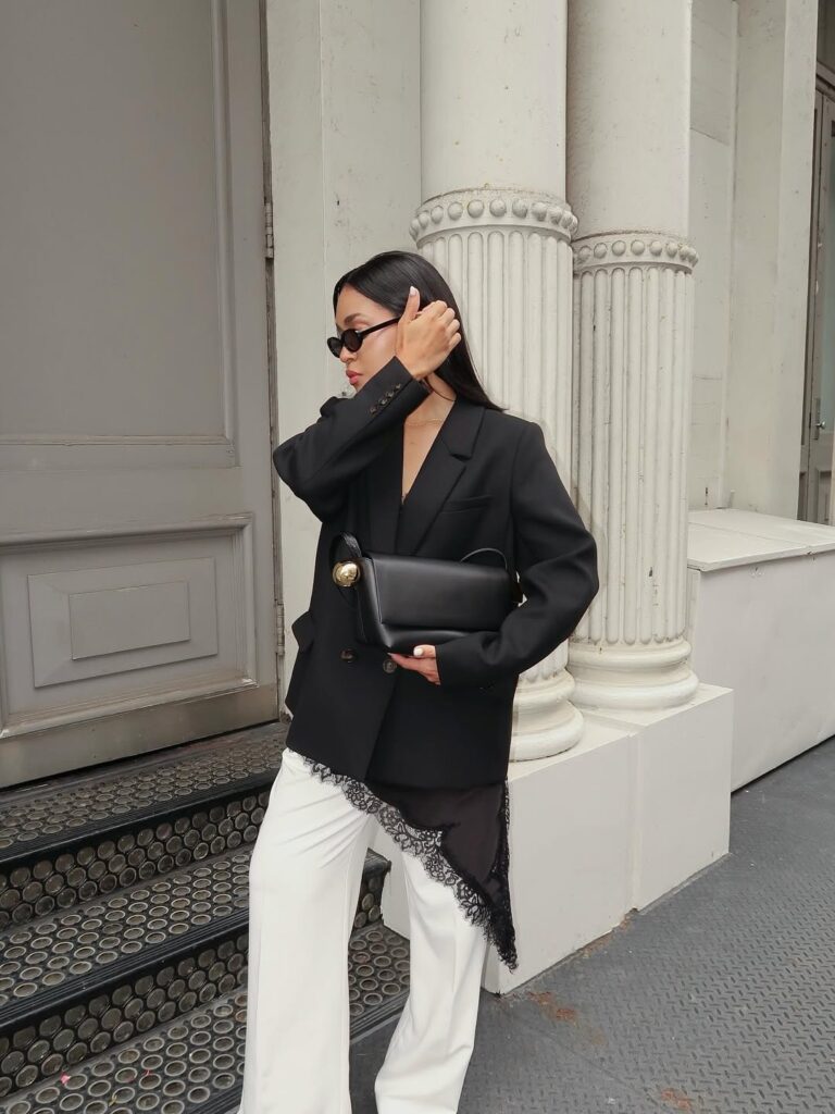 This chic ensemble pairs a black structured blazer with an asymmetric lace-trim slip layer and ivory trousers, creating a beautiful play of contrast and texture. The blazer provides a powerful silhouette, while the slip layer introduces softness and movement. The ivory trousers brighten the outfit and add balance. Ideal for dinners, fashion events, or elevated daytime outings, this look blends modern tailoring with subtle romantic details for a polished and unique effect.