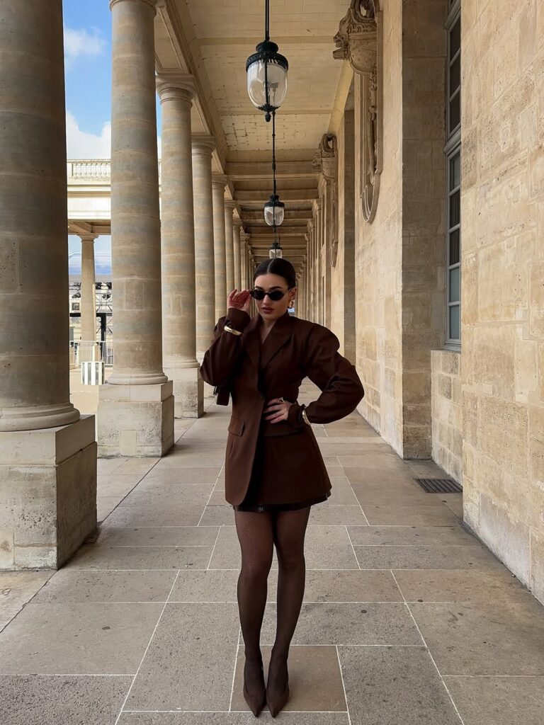 An oversized chocolate blazer dress paired with sheer tights creates a confident, fashion-forward outfit that blends structure with fluid elegance. The blazer dress delivers a strong silhouette while remaining comfortable enough for all-day wear. Meanwhile, the sheer tights soften the look, giving it a polished, sophisticated finish suitable for evening events, work dinners, or stylish daytime plans. The combination feels modern and versatile, moving effortlessly between professional and social settings while maintaining that unmistakable chic charm.