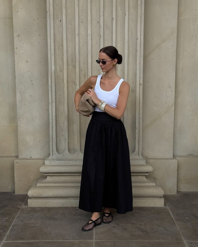 A white tank with a voluminous black maxi skirt creates a dramatic yet effortless outfit ideal for warm-weather outings or modern social events. The tank keeps the look simple and breathable, while the full skirt adds elegance and movement. This monochrome pairing feels timeless, allowing you to express style without excess. It’s comfortable, flattering, and undeniably chic.