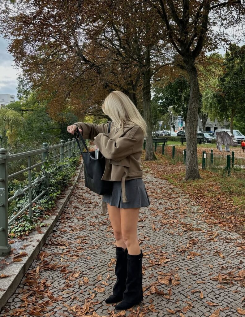 A taupe utility jacket styled with a pleated grey mini skirt balances casual utility with feminine soft structure. The jacket offers practicality and edge, while the pleated skirt adds movement and charm. This outfit is perfect for daytime activities, coffee meetups, or casual work environments where comfort and style need to coexist. The neutral tones make it easy to wear, while the combination of textures adds depth and visual interest. It’s chic, easy-going, and effortlessly modern.