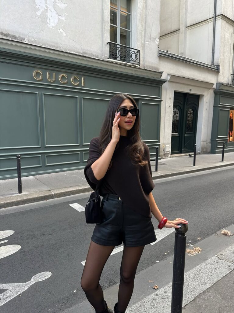 This outfit brings together the bold texture of a chunky black knit and the sleek contrast of leather shorts, resulting in a look that feels modern and subtly edgy. The oversized knit offers warmth and comfort, making this pairing ideal for transitional seasons or cool evenings out. The leather shorts add structure and sophistication, giving the outfit a dressed-up feel that works for casual dinners, relaxed gatherings, or creative daytime outings. This balance of cozy and contemporary creates an effortlessly chic vibe that stands out without trying too hard.