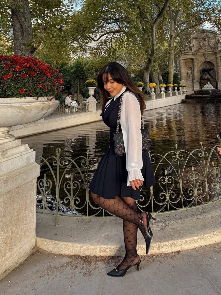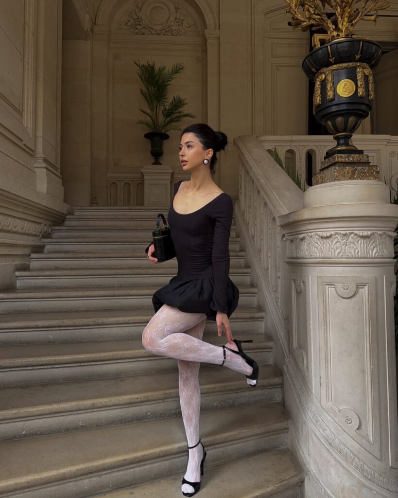 This outfit blends ballet-inspired elegance with whimsical charm. The black mini dress brings simplicity and structure, while the lace white tights introduce delicate pattern and contrast. Perfect for creative events, weekend outings, or date nights, this look feels youthful yet refined. The movement of the mini dress paired with the intricate tights creates a visually striking aesthetic that remains comfortable and wearable. It’s a chic choice for anyone who loves mixing classic silhouettes with modern romantic elements.