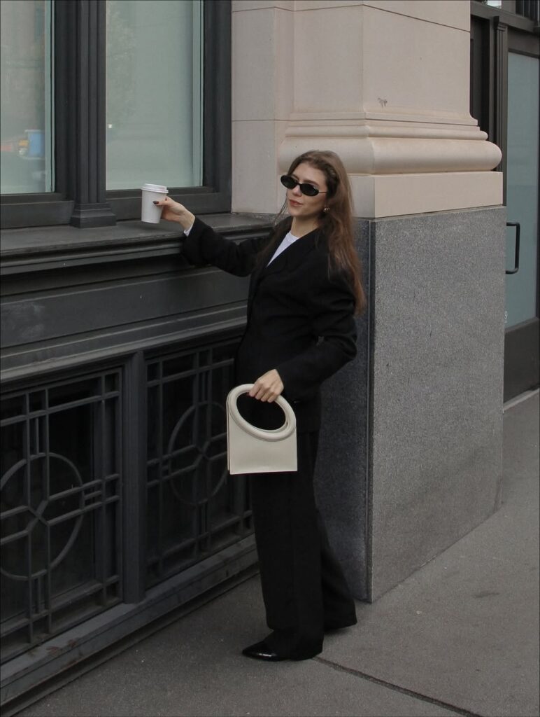 The tailored black power suit remains an icon of modern confidence, and pairing it with a sculptural ivory bag adds an artistic twist that elevates the entire ensemble. This outfit is perfect for business meetings, formal events, or any moment when you want to leave a lasting impression. The suit’s structured lines create a strong, streamlined silhouette, while the bold accessory softens the look with creative flair. It’s a sharp yet wearable combination that blends professionalism with contemporary elegance.