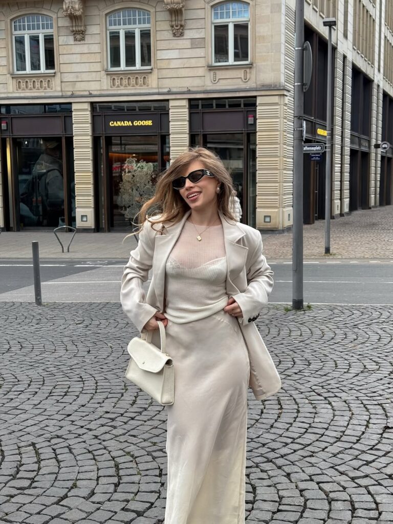 This outfit layers a champagne satin maxi skirt with a cream ribbed top and tailored blazer, creating a luxurious, soft-toned ensemble. The satin adds flow and glamour, while the ribbed top brings texture and comfort. The blazer completes the look with structure and polish. This combination is perfect for evening events, elegant lunches, or days when you want to feel especially refined. It balances glamour and wearability beautifully.