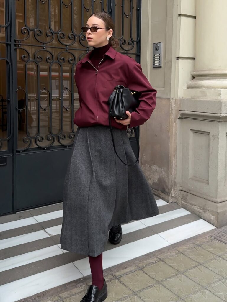 A burgundy zip jacket layered over a charcoal wool midi skirt creates a warm, sophisticated outfit ideal for fall and winter days. The jacket adds a sporty yet polished touch, while the wool skirt provides structure and comfort. Together, they produce a refined look that suits office settings, daytime city strolls, or relaxed social gatherings. The combination of rich tones and soft textures makes it effortlessly chic, offering both warmth and style in equal measure.