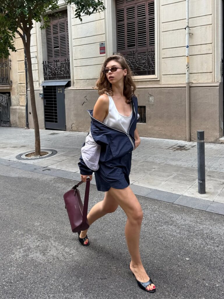 A silk camisole paired with sporty shorts and an oversized windbreaker creates a playful blend of luxury and athleisure. The camisole adds softness and sophistication, while the shorts introduce practicality and comfort. The windbreaker provides structure and a cool, urban edge. This outfit is ideal for casual days, travel, or weekend activities where comfort remains essential but style is non-negotiable. It’s chic, unexpected, and effortlessly cool.