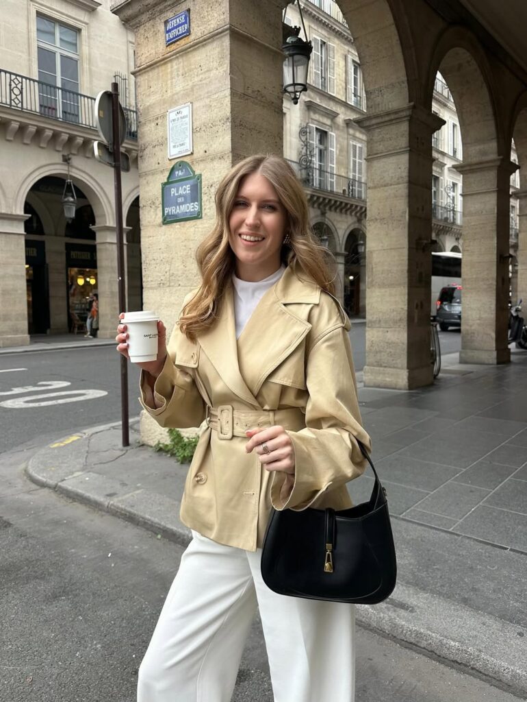 A belted sand trench paired with ivory wide-leg trousers creates a sculptural, refined silhouette perfect for transitional seasons. The trench provides structure and personality, while the trousers offer comfort and graceful movement. This ensemble is ideal for workdays, travel, or city outings where elegance and ease are equally important. The neutral palette enhances the look’s sophistication, making it chic in the most understated way.