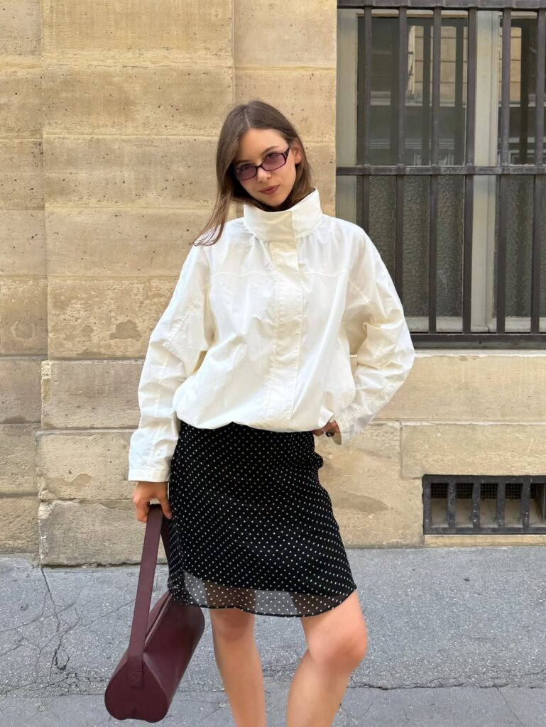 Combining a crisp white high-neck jacket with a sheer polka-dot mini skirt creates a striking contrast between sharp minimalism and playful femininity. This outfit is perfect for fashion-forward events, brunch dates, or modern evening outings. The structured jacket offers precision and sophistication, while the skirt brings movement and lightness. Together, they form a chic, contemporary look that balances polish and whimsy beautifully.