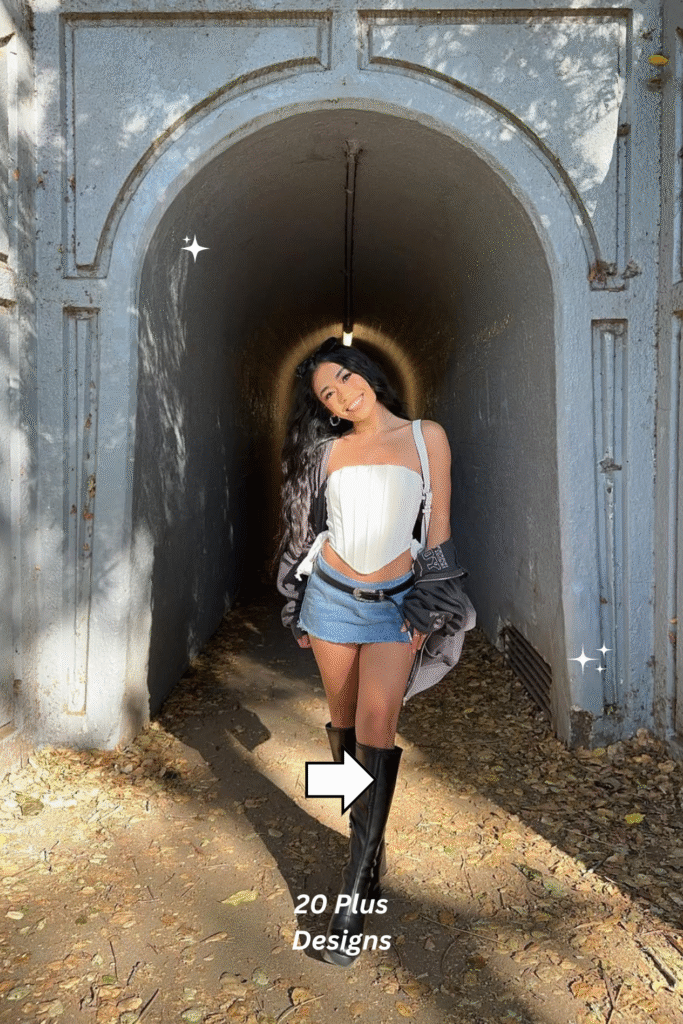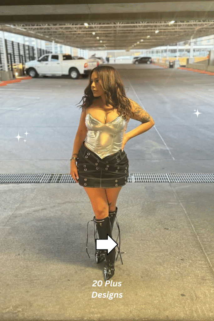 This look is made for the spotlight. Metallic details add high-shine glamour, while grommet accents and patent finishes bring out the rebellious concert vibe. It’s perfect for rock shows or electronic festivals — where attitude and allure go hand in hand.