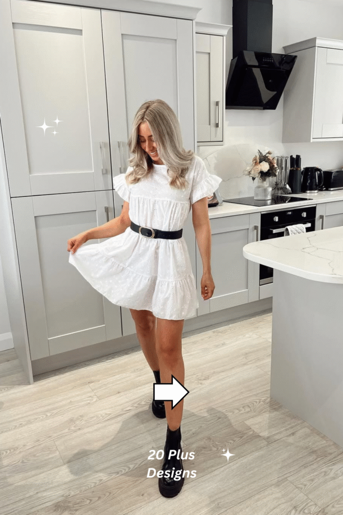 12. Eyelet Ruffle Mini Dress with Black Belt and Chunky Ankle Boots