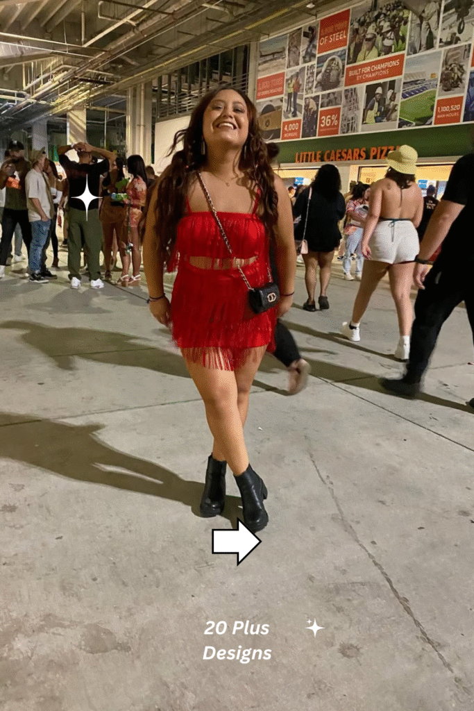 Vibrant and unforgettable, this outfit is designed to move with the music. The fringe detailing adds texture and flow, making it perfect for energetic shows. With its striking color and sleek accessories, it’s a powerful look for anyone who wants to own the dance floor.