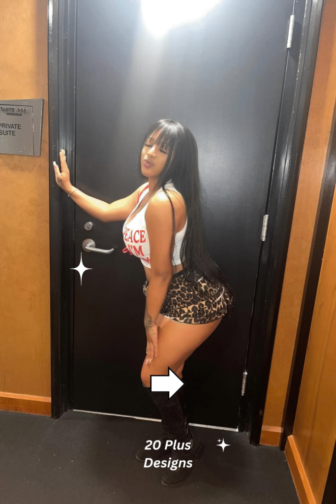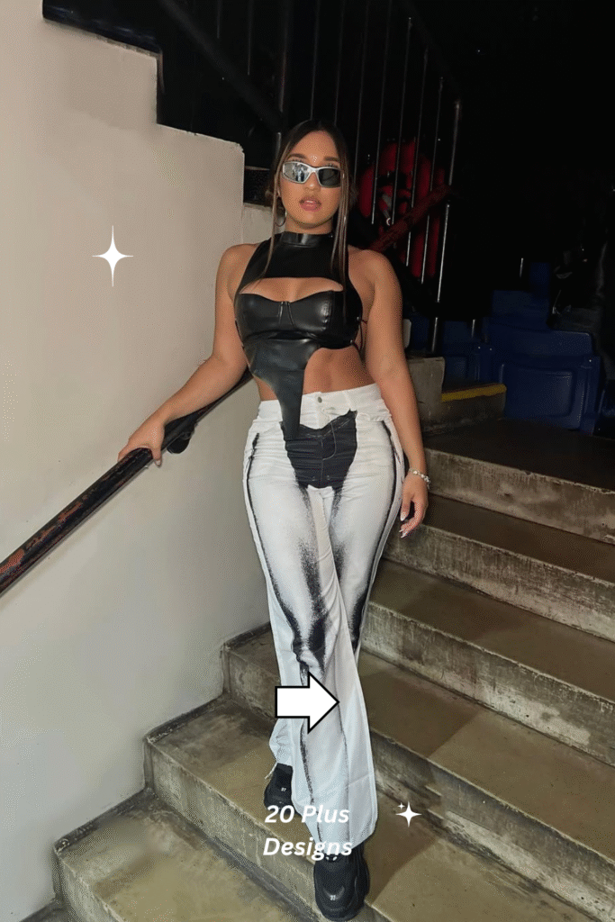 A bold, modern statement that captures the raw essence of concert fashion. The harness detail adds structure, while the abstract prints keep it visually exciting. Ideal for late-night rock or electronic performances, this look embodies daring individuality and unapologetic confidence.