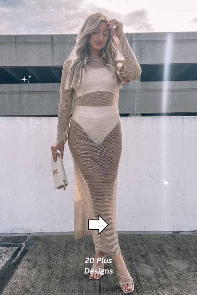 4. Beige Mesh Maxi Dress with Nude Underlay and Strappy Heels
