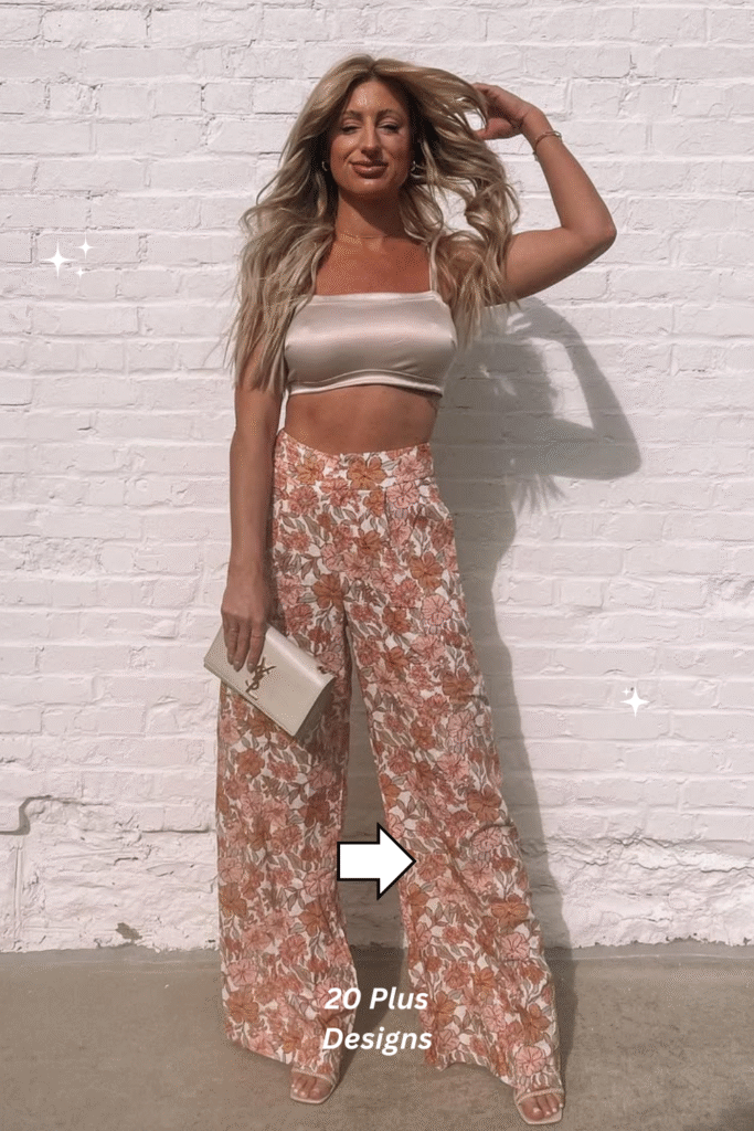 6. Champagne Satin Crop Top with Floral Wide-Leg Trousers