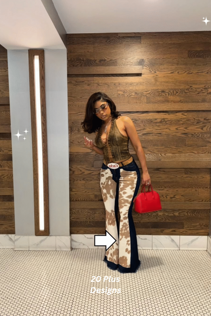 8. Olive Lace-Up Corset with Cow-Print Flared Jeans