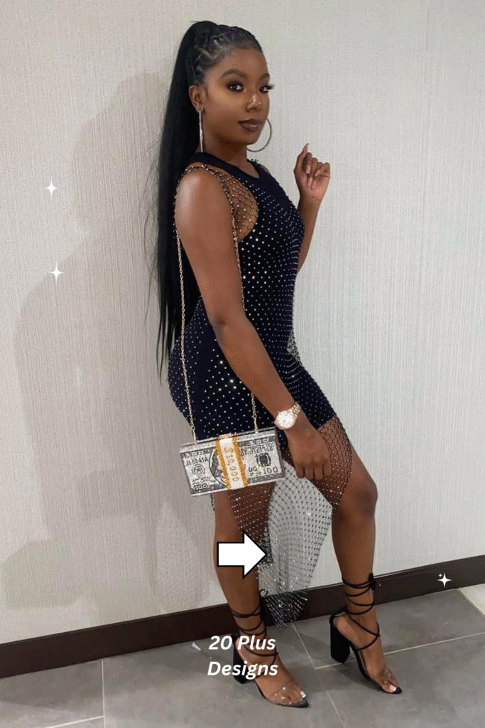 10. Midnight Mesh Rhinestone Dress with Lace-Up Heels