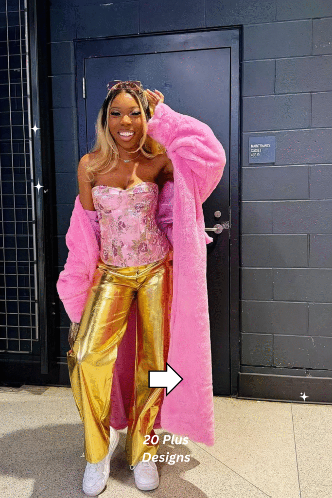 This is a showstopper look that radiates luxury and boldness. The gold trousers exude star power, while the floral corset adds femininity and contrast. Topped with a faux fur coat, it’s ideal for evening concerts or glamorous indoor venues. Each piece works together to create a perfect mix of confidence, creativity, and sophistication.