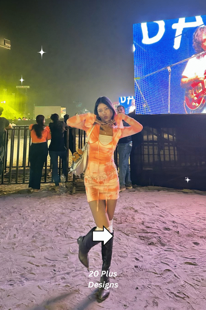 Fierce and fashion-forward, this bodycon dress hugs your figure while the marble print keeps it modern and trendy. The leather boots add an edge that’s both powerful and sleek. It’s an ideal concert look for anyone who loves a mix of artistry and attitude. Perfect for R&B or soul shows where individuality shines.