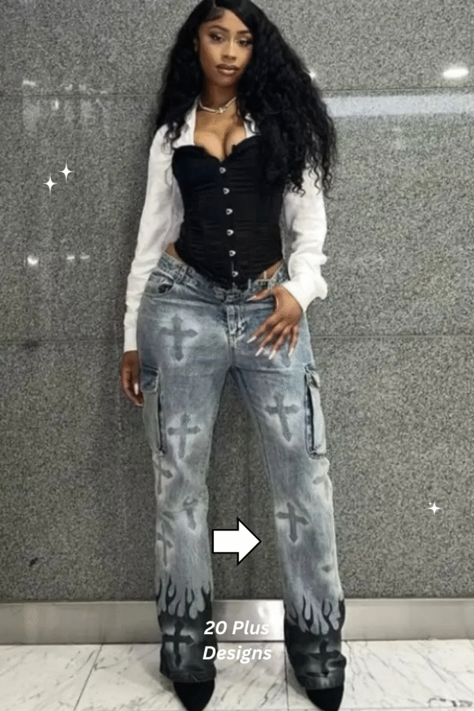 This layered look is the definition of street-style sophistication. The structured corset contrasts perfectly with the casual white shirt, while flame-print denim adds bold energy. It’s ideal for high-energy concerts or festivals where creativity takes the stage. Add chunky jewelry to finish the look with extra flair.