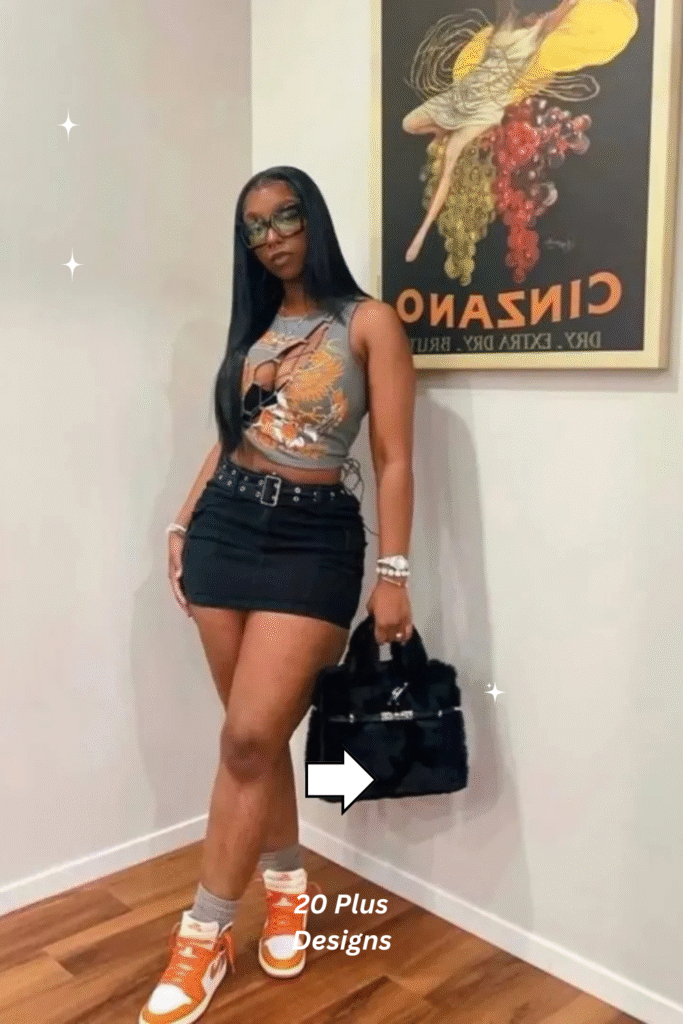 This outfit is youthful, daring, and full of attitude. The cutout details make it stand out, while the belted mini skirt gives structure and polish. It’s ideal for high-energy concerts or casual shows where you want to move freely while staying stylish. Add platform boots or sneakers for an effortlessly bold finish.