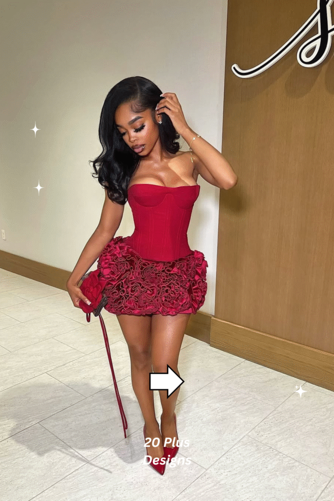 Romantic and bold, this crimson corset dress is designed for women who want to steal the spotlight. The corset silhouette flatters every curve, and the ruffle skirt adds a flirtatious, feminine edge. Perfect for R&B concerts or date-night shows, this outfit embodies both strength and softness. Pair with gold jewelry to complete the luxe mood.