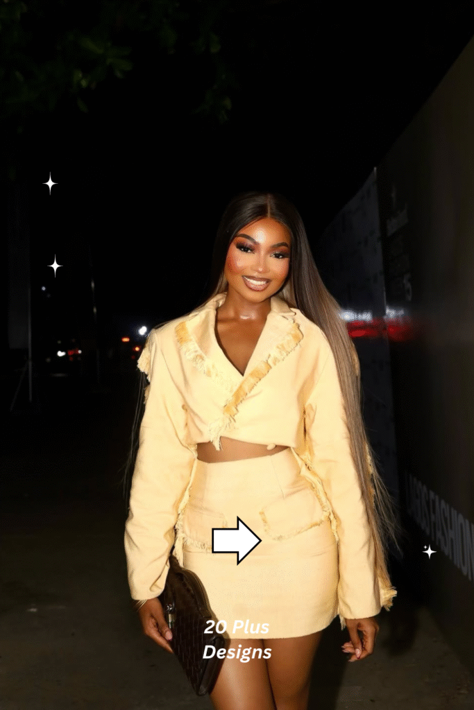 This look redefines sophistication for the concert scene. The matching blazer and skirt create a polished silhouette, while the frayed edges keep it fresh and unexpected. It’s the perfect outfit for women who love structure with a touch of personality. Gold accessories and nude heels elevate it effortlessly from day to night.