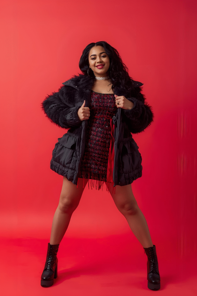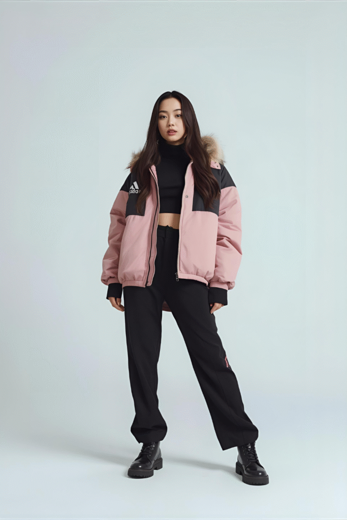 Go for an active-meets-stylish look that’s comfortable yet cool. Think track-inspired layers, sneakers, and sleek fits that move easily. It’s perfect for standing, dancing, and enjoying every beat without sacrificing your winter warmth.
