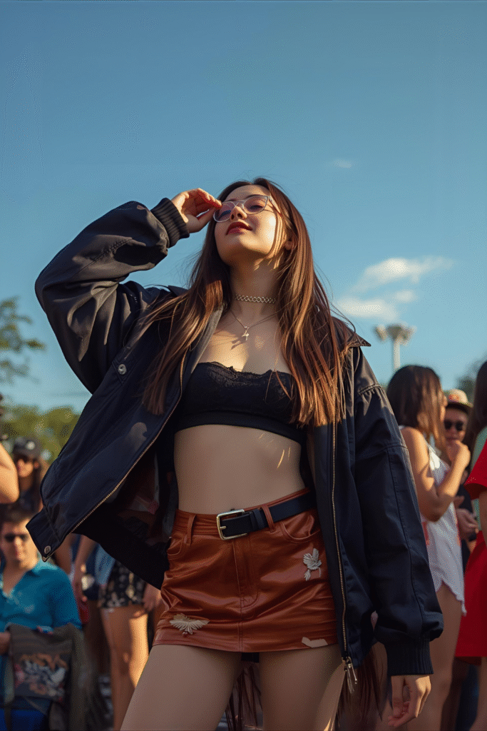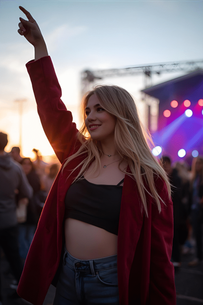 Concerts are the perfect excuse to shine—literally! Add sequins, glitter, or metallic fabrics for that star-like glow under the lights. Keep the rest of your look minimal to let the sparkle take center stage. You’ll dazzle every time the spotlight hits.