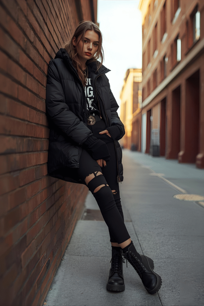 You can never go wrong with an all-black winter concert outfit. It’s sleek, slimming, and always stylish. Mix different fabrics like leather, wool, and mesh for texture and depth. Black absorbs warmth, making it ideal for cooler weather while looking effortlessly fierce.