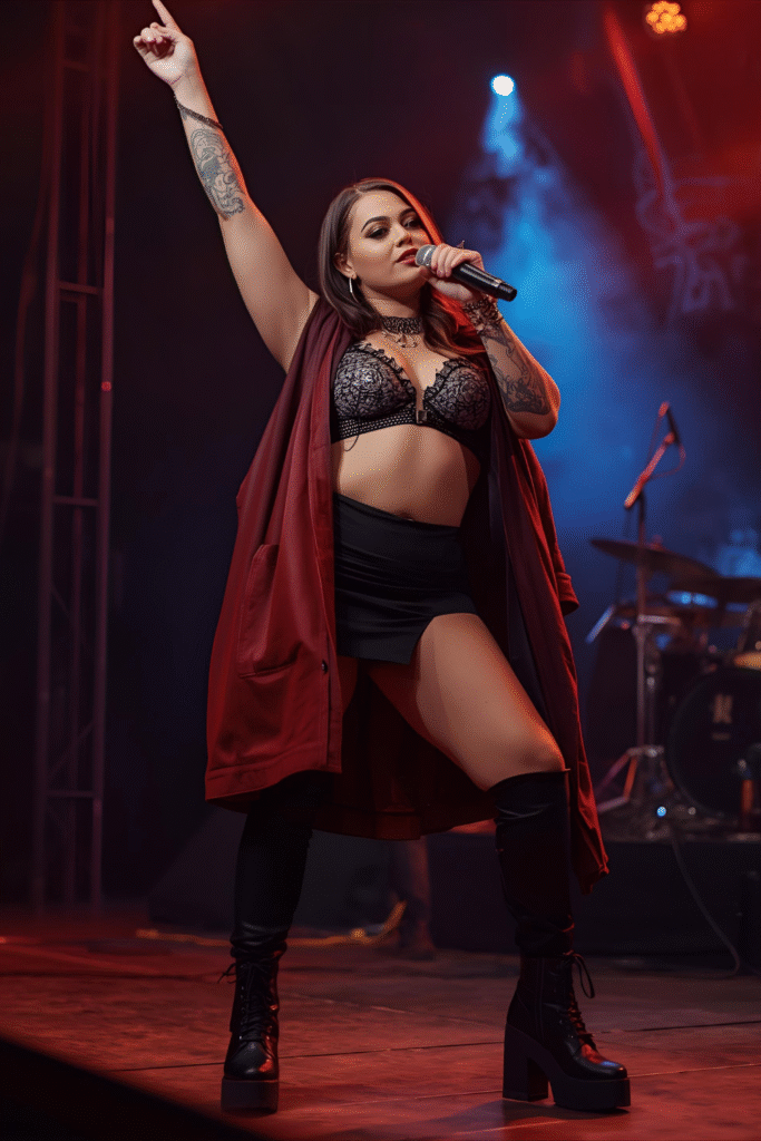 Add glam-rock edge to your winter concert outfit with metallic accessories, bold makeup, and edgy layering. Think statement belts and shimmery accents. It’s fierce, confident, and screams rockstar energy. Perfect for a high-energy crowd.