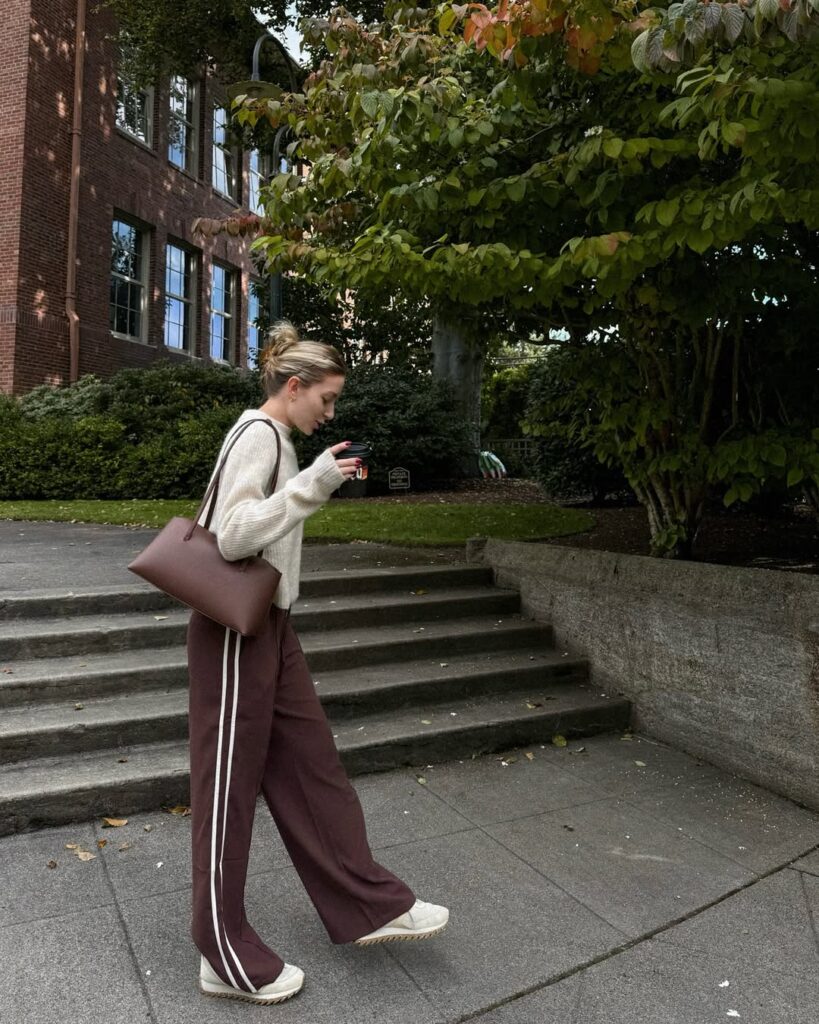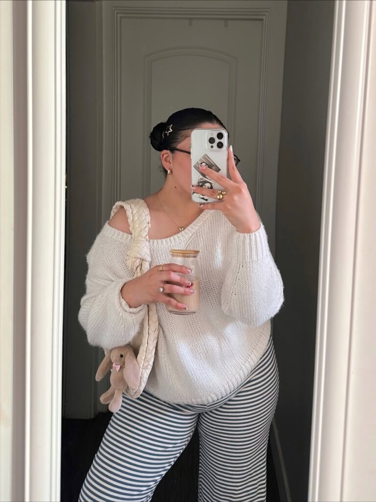 A cream knit sweater paired with striped lounge trousers creates a relaxed yet elevated ensemble that blends comfort with subtle sophistication. The cream knit offers softness and simplicity, while the striped trousers introduce a playful, elongated effect that makes the outfit feel more styled. This look is great for at-home days, creative work settings, or outdoor errands where comfort is key. The mix of gentle color and clean lines gives a warm, serene vibe that feels polished without any effort.