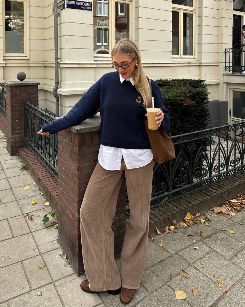 A navy knit sweater and corduroy trousers create a timeless, textured outfit ideal for colder seasons. The deep navy tone adds richness, while the corduroy introduces warmth and tactile appeal. This pairing offers structure without sacrificing comfort, making it great for dinner outings, office-casual days, or weekend activities. The contrast between the smooth knit and ribbed corduroy adds depth to the look, creating a cozy yet polished aesthetic that feels seasonally perfect.