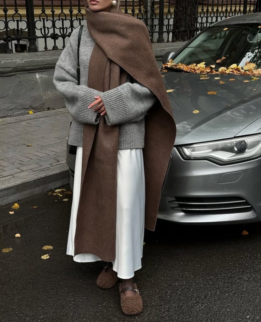 This combination is made for chilly days when comfort and layering become essential. The oversized knit sweater provides a soft, enveloping silhouette that feels warm without compromising style, while the cascading wool scarf adds refinement and dramatic movement. Together, they create a cozy, layered look with depth and texture. Ideal for winter strolls, morning commutes, or weekend outings, this pairing blends practicality with elegance, giving you warmth and modern minimalism in one effortless outfit.