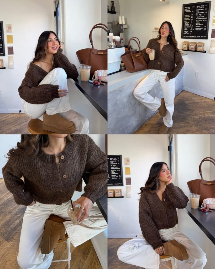 The earthy tone of a chestnut knit cardigan pairs beautifully with the crisp, clean look of ivory denim. This combination offers a soft but structured feel, making it perfect for cool days when you want something warm without being overly layered. The cardigan brings texture and coziness, while the denim adds a modern, fresh contrast. Great for casual meetups, weekend exploring, or cozy days in the city, this look balances neutral tones with timeless style for a chic, understated outfit.