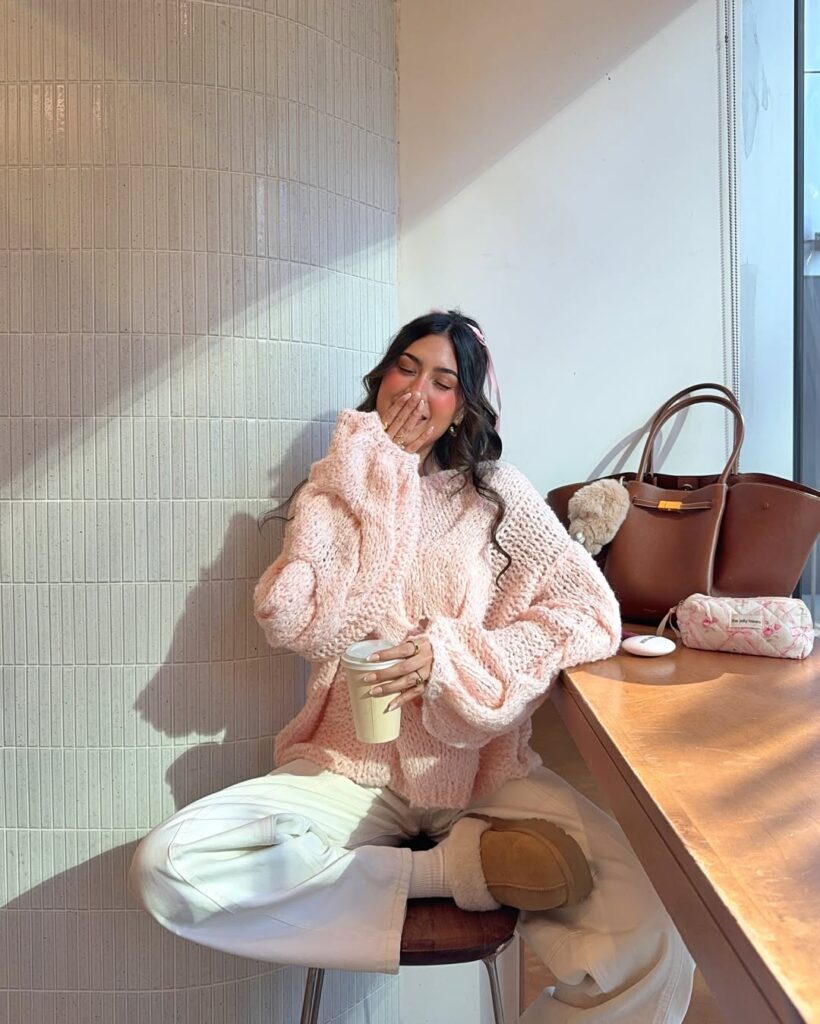 A chunky pink knit sweater paired with white joggers creates a fresh, upbeat, and cozy aesthetic. The sweater’s bold texture adds warmth and personality, while the joggers keep the outfit relaxed and easy-moving. This combination is perfect for relaxed mornings, study days, or laid-back social plans. The light and playful color palette feels youthful yet polished, balancing vibrant femininity with effortless comfort—making it an ideal cozy outfit for everyday wear.