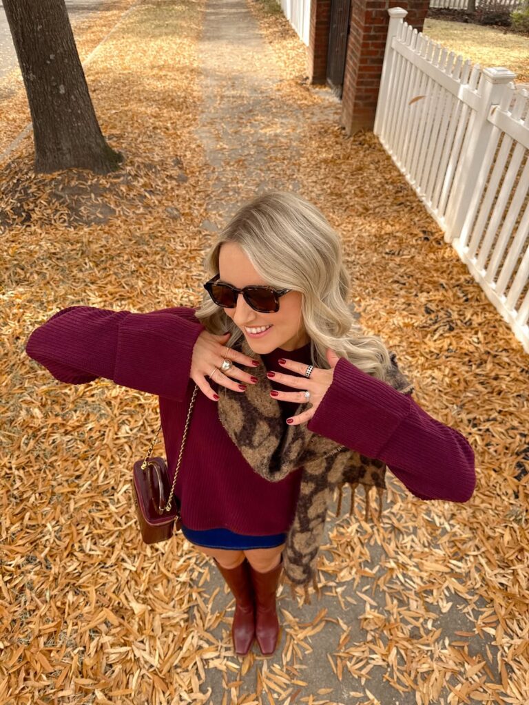 The deep burgundy knit sweater brings richness and warmth to this outfit, setting a stylish foundation that pairs beautifully with chestnut knee-high boots. The contrast between the cozy knit and polished leather adds structure and refinement, making the look ideal for outings that require a touch of sophistication. Perfect for brunches, day dates, or even casual Fridays at the office, this outfit strikes a balance between autumnal charm and timeless chic. It feels cozy while still making a confident, seasonal statement.