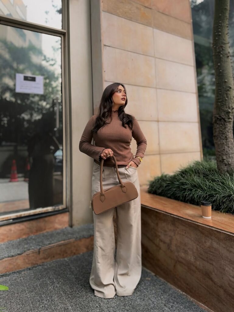 This pairing blends texture and warmth for an outfit that feels as elegant as it is comfortable. The cocoa ribbed knit offers a soft, close-to-body fit that adds a hint of understated sophistication, while the ivory linen trousers add a breezy, lightweight contrast. Even in cooler months, thicker linen works beautifully when styled with knits, giving the look a grounded yet airy feel. Perfect for casual lunches, coffee dates, or creative-office environments, the combination balances earthy warmth with clean tailoring—creating a cozy look that never feels too heavy.